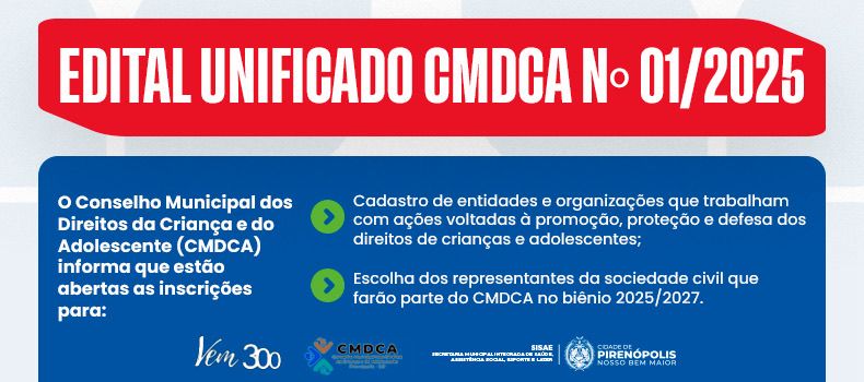 O Conselho Municipal dos Direitos da Criança e do Adolescente (CMDCA) de Pirenópolis-GO anuncia a abertura do Edital Unificado nº 01/2025, que regulamenta dois importantes processos: